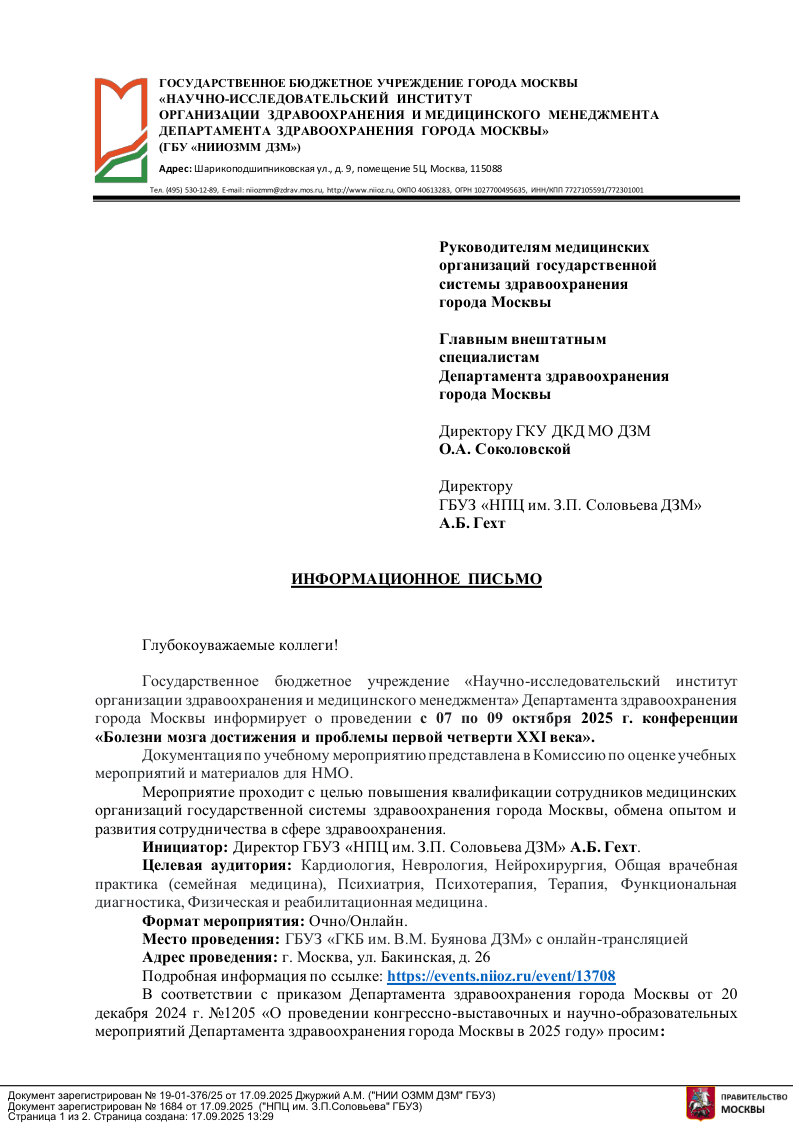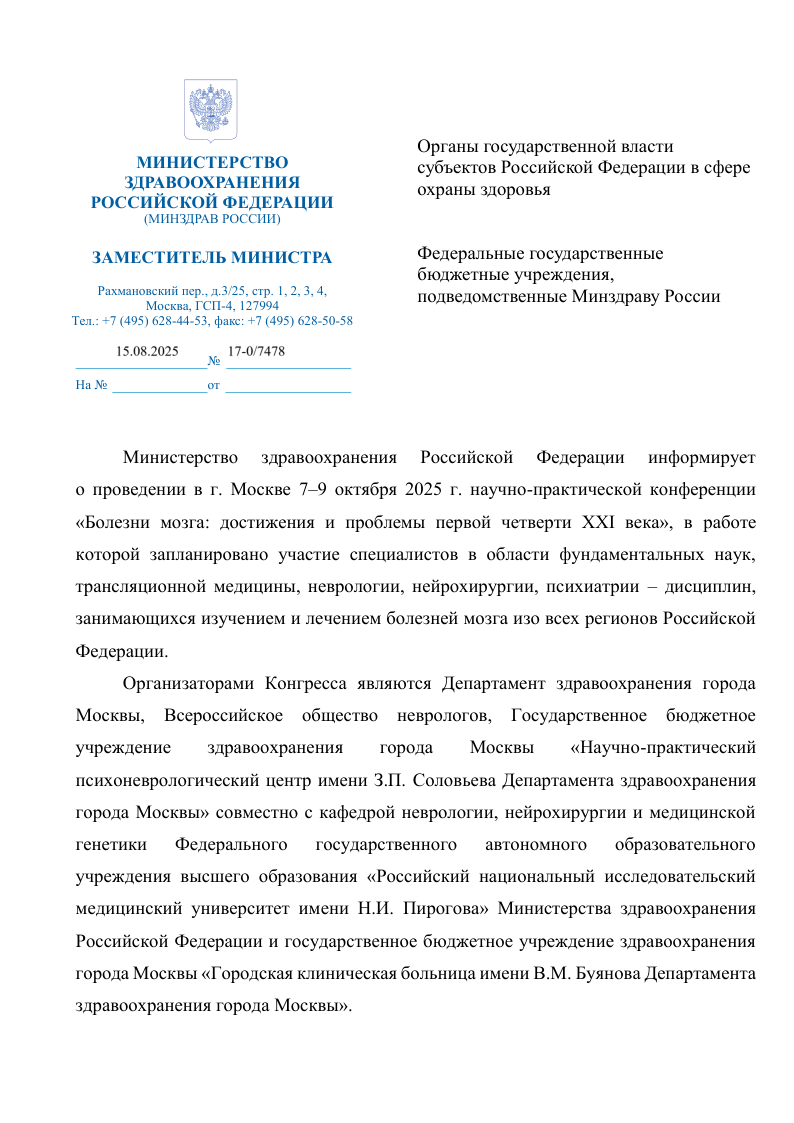 На протяжении многих лет под эгидой Министерства здравоохранения Российской Федерации, Департамента здравоохранения города Москвы и Всероссийского общества неврологов ГБУЗ Научно-практический психоневрологический центр имени З.П. Соловьева Департамента здравоохранения города Москвы проводит научные и образовательные мероприятия, пользующиеся большим вниманием специалистов Москвы, многих регионов России, стран ближнего и дальнего зарубежья. Ключевыми организаторами конференции также являются ГБУЗ Городская клиническая больница им. В.М. Буянова ДЗМ, кафедра Неврологии, нейрохирургии и медицинской генетики и кафедра Фундаментальной нейрохирургии РНИМУ им. Н.И. Пирогова. В число лекторов входят ведущие ученые, освещающие последние достижения науки и практики в области болезней мозга. Конференция дает возможность специалистам в области клинических и фундаментальных аспектов неврологии, психиатрии и смежных дисциплин, обмениваться опытом и обсуждать актуальные проблемы и инновационные решения. Все участники получают наиболее актуальные данные современных исследований, новых технологий диагностики и лечения, а также знакомятся с нормативной базой, включая знания по клиническим рекомендациям, организации здравоохранения и маршрутизации больных.
